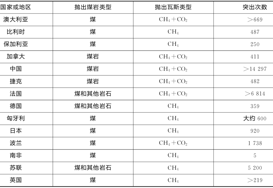 煤与瓦斯突出是一个世界性的煤矿开采时发生的动力现象,几乎所有的产煤国家都发生过煤与瓦斯突出。目前,世界上共发生30000多次煤与瓦斯突出。世界主要的采煤国家发生的煤与瓦斯突出情况如表1所示。