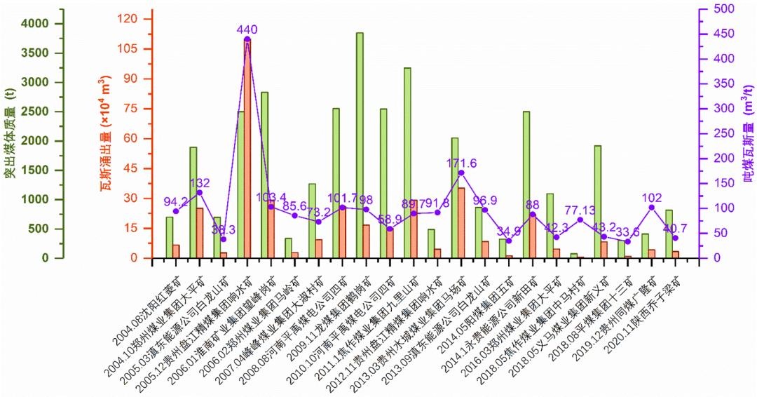 近年来突出事故的涌出瓦斯量相对较少,除个别案例外,每吨突出煤涌出瓦斯量多在30~50 m³,而以往特大型突出的吨煤瓦斯量多在100 m³以上,这显示出在两个四位一体瓦斯治理技术体系下,煤层中的瓦斯含量和瓦斯压力等得到一定程度的降低。