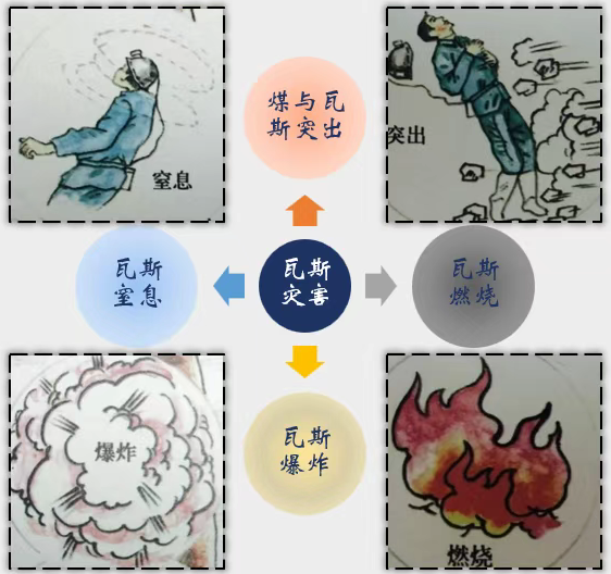 我国煤矿事故的统计分类,煤矿瓦斯事故分为煤与瓦斯突出、瓦斯爆炸、瓦斯燃烧和瓦斯窒息四类,其中前两类发生最多,危害最大。