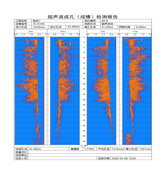 在工程测试中,设计孔深41.000米、孔径1.25米。实测该孔桩孔深41.383米,平均孔径1.316米,垂直度为1.178%。检测结果能够清晰反映桩孔结构特征,为施工过程中的质量控制提供了重要依据。